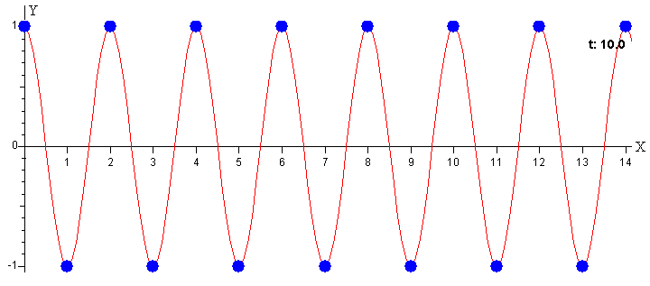 Esaterako, lehen pendulua, n=0, y=+A posizioan badago (eta N bikoitia bada), orduan bigarren pendulua y= -A posizioan egongo da, eta hirugarrena y=+A posizioan eta horrela behin eta berriz.