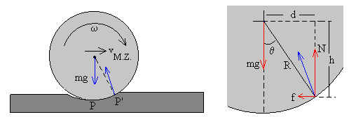 Demagun billar-bola bat tapiz-mahaiaren gainean errodatzen. Ezkerreko irudiak erakusten duenez, mahaiaren erreakzioa kontaktu-gainazalarekiko perpendikularra da, baina P' puntuan aplikatzen da, P puntutik oso hurbil, baina pixka bat aurreratuta. Ondorioz, mahaiaren erreakzioa ez da bertikala, osagai horizontala ere badu. Dei diezaiegun osagai bertikalari N eta horizontalari f. Erreakzioaren osagai horizontalak (f-k) bolaren translazioaren aurkako noranzkoa du. Bestalde, errotazioari dagokionez, momentu erresultantea hau da: f·h-N·d , eta errotazioaren aurkako noranzkoa du. Hona hemen higiduraren ekuazioak:
