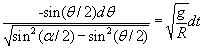 Integral berri horretan, u0=1 hasierako posizioari dagokio, alegia θ=α. Bestalde, Ö(g/R) pendulu sinple baten oszilazioen maiztasun angeluarra da, penduluaren luzera eta eraztunaren erradioa berdinak balira. Maiztasun hori Ω izendatu dugu. Geratu den azken integrala berehalakoa da eta edozein taulatan aurki daiteke: