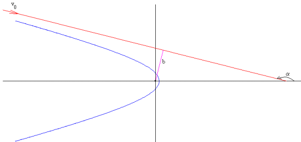 Supongamos que un asteroide de masa m se aproxima a un planeta de masa M con velocidad v0 en el infinito siguiendo una dirección (recta de color rojo) que dista b del centro del planeta tal como se muestra en la figura. A medida que el asteroide se acerca al planeta, va cambiando su velocidad tanto en módulo como en dirección (en color azul), hasta que se aleja hacia el infinito siguiendo una dirección simétrica respecto del eje X, que es la asíntota de la otra rama de la hipérbola.