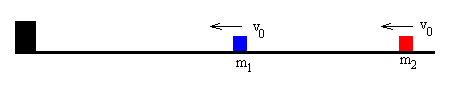 Supongamos dos partículas de masas m1 y m2 que llevan la misma velocidad v0 y se dirigen al final del carril, tal como se muestra en la figura.