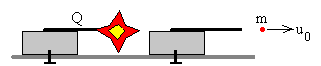 Supongamos que el carro está firmemente sujeto al suelo y se dispara un proyectil de masa m. La combustión de la pólvora en el ánima del cañón proporciona una energía cinética Q al proyectil. La velocidad u0 de salida del proyectil es