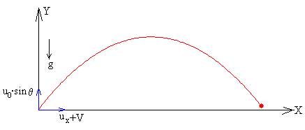El cañón siempre dispara hacia adelante, pero el carro puede moverse hacia adelante o hacia atrás. Cuando se mueve hacia atrás V<0, para un determinado ángulo de tiro θ la componente horizontal ux+V de la velocidad es nula, el alcance horizontal x es nulo, el proyectil sube y baja a lo largo del eje Y.