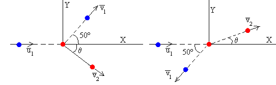 2.-Una partícula de 5 kg de masa, moviéndose a 2 m/s choca contra otra partícula de 8 kg inicialmente en reposo. Si el choque es elástico y la primera partícula se ha desviado 50º de la dirección original del movimiento, calcular la velocidad de cada partícula después del choque