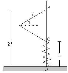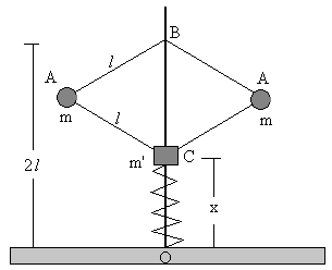 El regulador centrífugo de la figura, está constituido por cuatro barras articuladas de masa despreciable y de la misma longitud l, que giran alrededor de un eje vertical, estando el sistema de barras fijado al punto B. El cuerpo de masa m' que puede deslizar sin rozamiento a lo largo del eje, está apoyado en un resorte de constante k. Las bolas en las articulaciones A de las barras son iguales y de masa m. Cuando el sistema está en reposo C coincide con O y BO mide 2l.