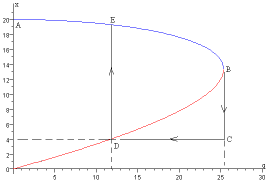 El comportamiento del sistema viene descrito por la curva de color azul AB de la figura, que corresponde a las posiciones de equilibrio estable.