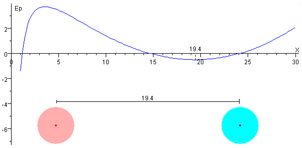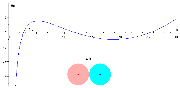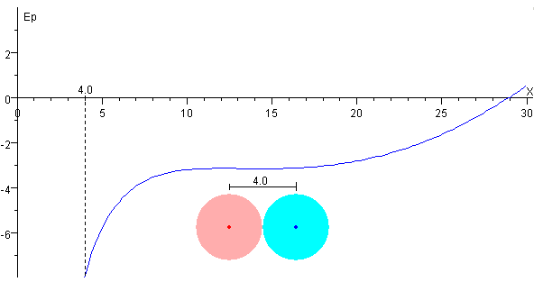 Observamos el comportamiento del sistema formado por las dos esferas cargadas, en relación a la curva de energía potencial para cada carga q. El sistema adopta la configuración de energía potencial mínima, compatible con que la separación mínima posible es 2r.