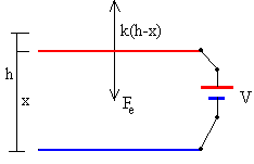 Sea h la distancia entre las placas cuando el condensador no está conectado a la batería. Cuando se conecta la batería, las placas del condensador adquieren cargas iguales y opuestas y se atraen. Como consecuencia la separación entre las placas disminuye a x.