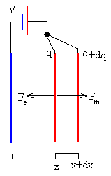 Supongamos que incrementamos en dx el espaciado entre las placas ejerciendo una fuerza mecánica exterior Fm sobre la placa móvil igual y opuesta a la fuerza de atracción eléctrica Fe entre las placas.