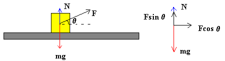 Consideremos de nuevo el bloque sobre la superficie horizontal. Si además atamos una cuerda al bloque que forme un ángulo θ con la horizontal, la fuerza normal deja de ser igual al peso. La condición de equilibrio en la dirección perpendicular al plano establece N+ F·sinθ =mg