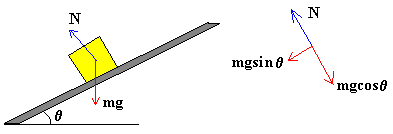Si ahora, el plano está inclinado un ángulo θ , el bloque está en equilibrio en sentido perpendicular al plano inclinado por lo que la fuerza normal N es igual a la componente del peso perpendicular al plano, N=mg·cosθ