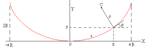 La cicloide es simétrica, por lo que situamos el eje Y como eje de simetría, y el origen en la parte más baja de la curva, tal como se muestra en la figura. La ecuación de la cicloide referida a estos ejes es