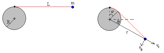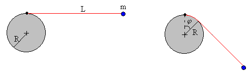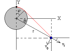 Cuando la partícula cae, en el instante t la parte de la cuerda que está enrollada en el cilindro es la longitud Rφ del arco de una circunferencia de radio R. Describiremos el movimiento de la partícula en términos del ángulo φ.
