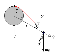 Finalmente, expresamos la tensión de la cuerda y la ecuación del movimiento en términos del ángulo φ y sus derivadas.