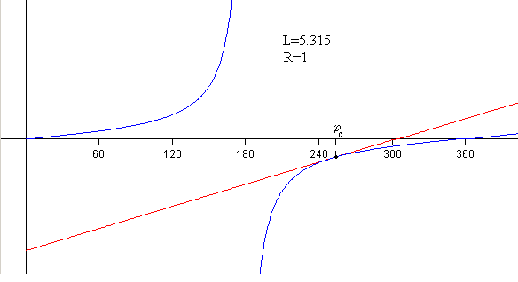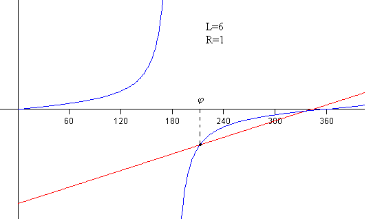 Como vemos en la figura, la recta y=(3/2)(φ-L/R) y la función y=tan(φ/2) se cortan en el punto de tangencia. En el punto de corte la pendiente de la función es 3/2.