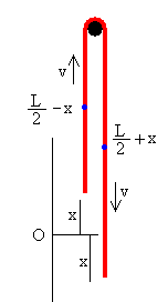 Situamos el origen en la posición de los extremos de la cadena cuando está en equilibrio inestable, tal como se muestra en la figura de la izquierda.
