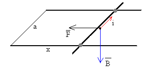 Una corriente i que circula por la porción de varilla de longitud a, experimenta una fuerza F en el seno de un campo magnético uniforme B.