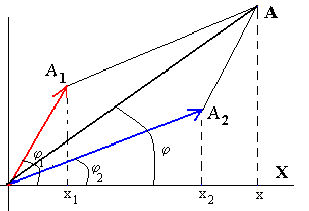La amplitud A y la fase inicial φ del MAS resultante se obtiene sumando los vectores rotatorios A1 y A2, de longitudes 2 y 5, respectivamente, que forman 45º y 90º con el eje X.