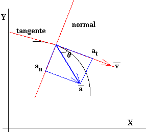 - Se determina el ángulo θ entre el vector velocidad y el vector aceleración, y se calcula el valor numérico de dichas componentes: at=a cosθ y an=a sinθ