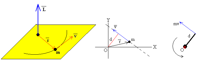 - Se traza la dirección de la velocidad v y se dibuja y calcula la distancia d del origen O a dicha recta. El módulo del momento angular de la partícula es el producto L=mv·d.
