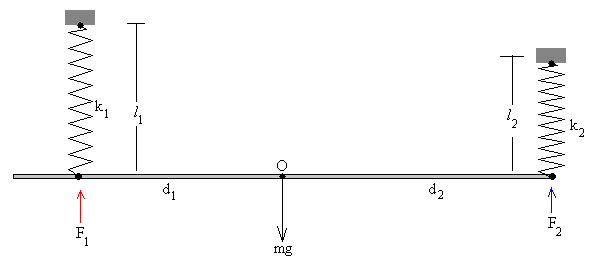 La varilla delgada de masa m kg y longitud L pende de dos muelles elásticos verticales de constantes k1 y k2 y de longitudes l01 y l02 sin deformar, situados a una distancia d1 y d2 a uno y otro lado del c.m de la varilla