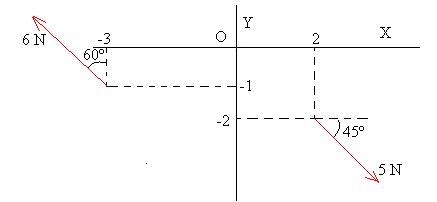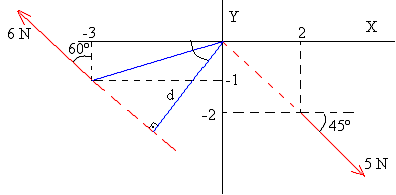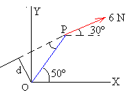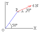 Hallar el momento (módulo dirección y sentido) de la fuerza F de módulo 6 N respecto del origen. El punto P de aplicación de la fuerza se encuentra a 45 cm del origen. |